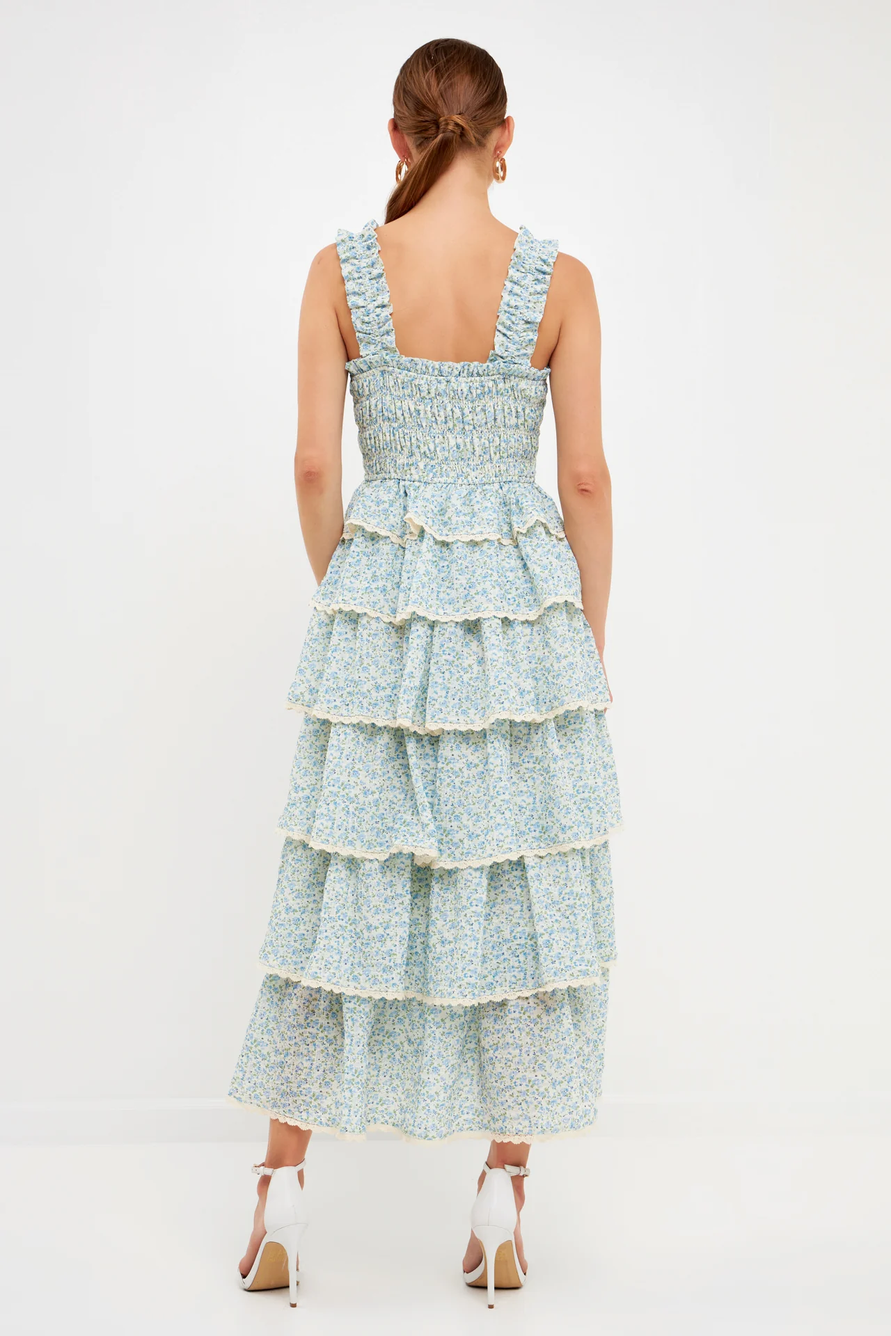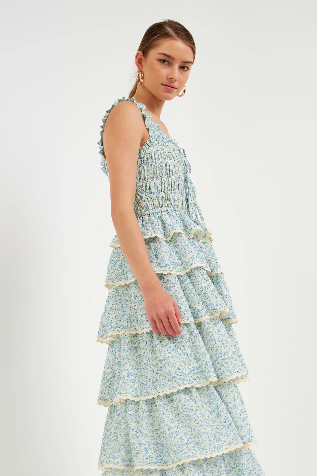Gridded Texture Floral Smocked Tiered Maxi Dress
