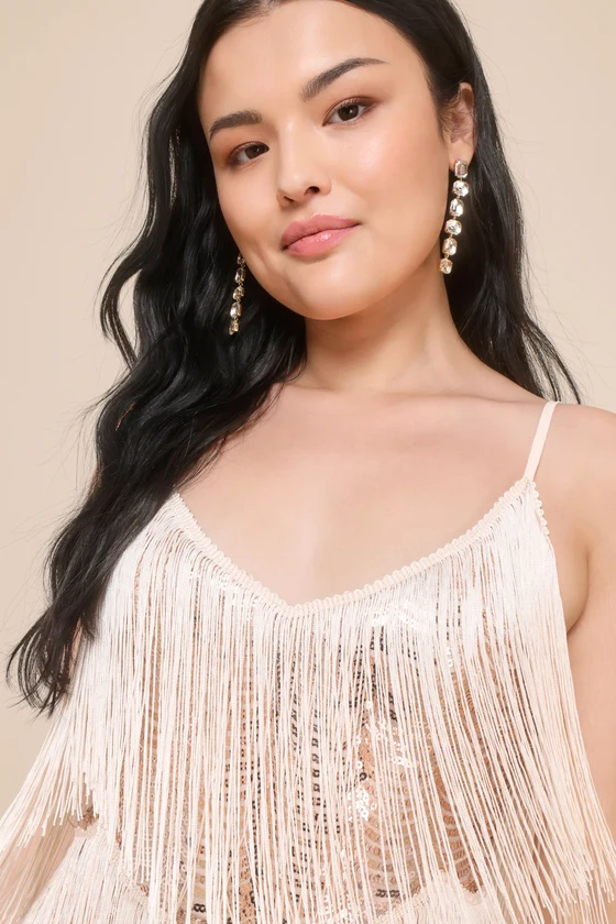 Get in the Groove Champagne Sequin Fringe Bodycon Dress
